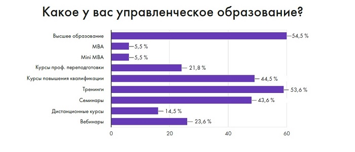 Однако специализированное управленческое образование (высшее, MBA, тренинги, семинары и т.д.) есть только у половины опрошенных (51,1%). Из них более половины имеют высшее управленческое образование (54,5%) и посещают тренинги для менеджеров (53,6%). Кроме того, среди управленцев популярны курсы повышения квалификации (44,5 %) и семинары (43,6%).